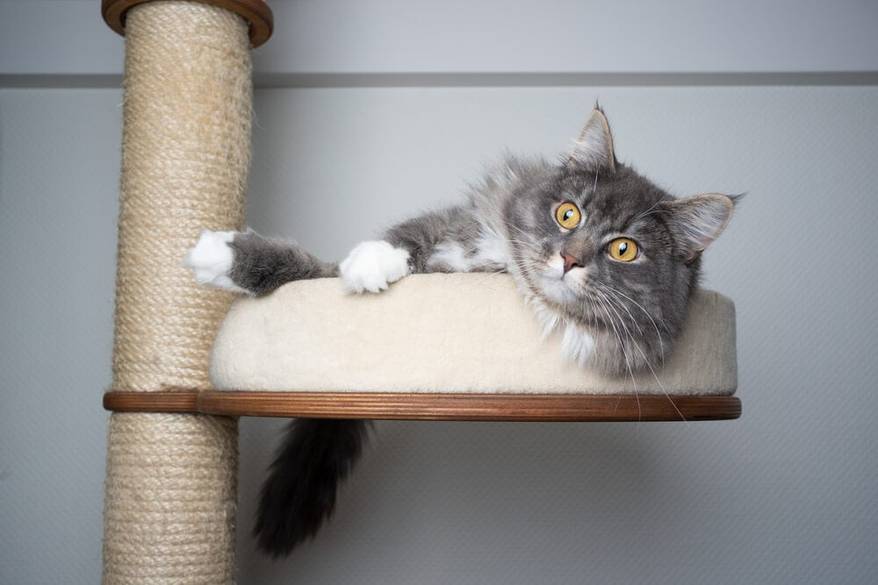 You'll also need several scratch objects, litter boxes and cat litter. Use the 1+1 rule for litter boxes and scratch objects: at least one per cat, plus one. Multiple scratch objects and litter boxes makes it less likely that cats will argue over resources, and even single cats prefer to have options. Some cats like to use one box for liquid waste and another for solid waste, and keeping a variety of scratchers in the home allows them to experiment with different styles. For example, you might place a vertical post near their potty and a horizontal pad by their food bowl.