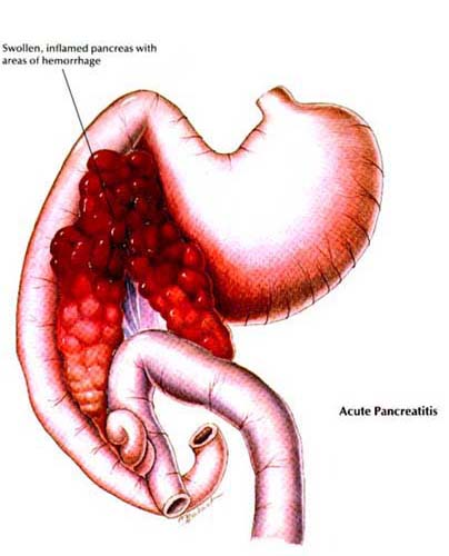 Pancreatitis: An inflammation or infection of the pancreas (an elongated, tapered gland that is located behind the stomach). Origins are frequently unknown. Potential causes are feeding foods high in fat or rich table foods, infections, disease or trauma.