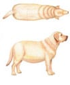 Body Condition Score, or BCS, is the ratio of lean to fat (or adipose) body mass. Lean body mass is the weight of your dog's bones, muscles, etc. Fat body mass, or adipose tissue, is simply that -- the fat. The higher the BCS, the more weight your dog will need to lose, with the ideal BCS at 3 out of 5. If your dog's BCS is more than 3, you should ask your vet for a healthy weight-loss plan. Here is a handy diagram to monitor your dog's BCS at home: