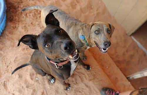 "Chama is a cattle dog mix that came to Best Friends Animal Sanctuary less than a year ago after he started having issues with the children in his home," says Julie Tasch, Dogtown manager at Best Friends Animal Society in Kanab, Utah. "He went into group housing with a couple of dogs, one of which was named Cardinal. Cardinal is a golden retriever mix that arrived a little bit before Chama and was completely feral. Cardinal had zero leash skills, wouldn't get in a car, and was terrified of people, but he loved other dogs."